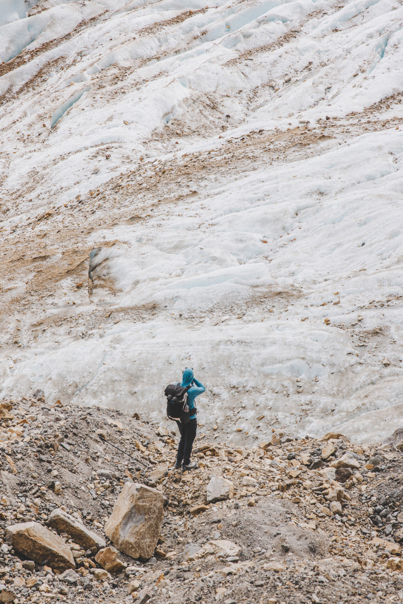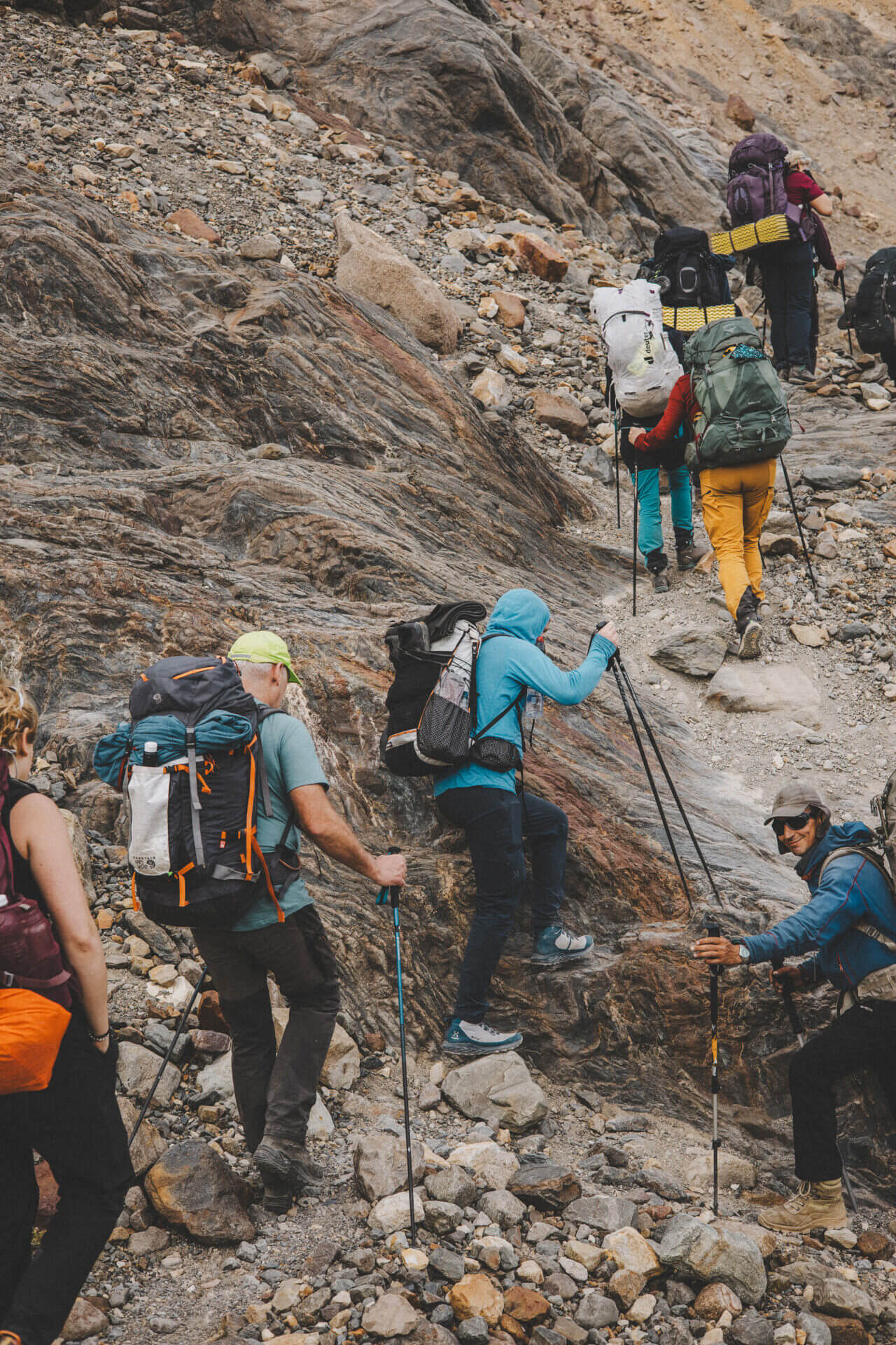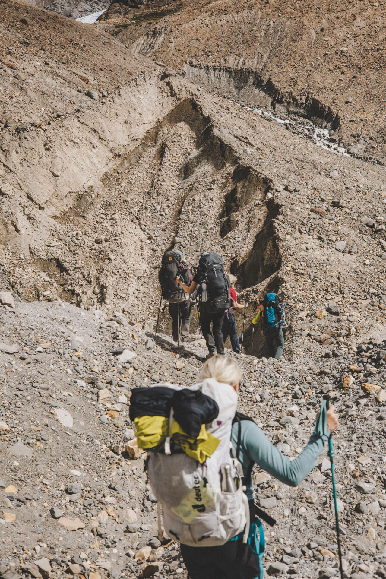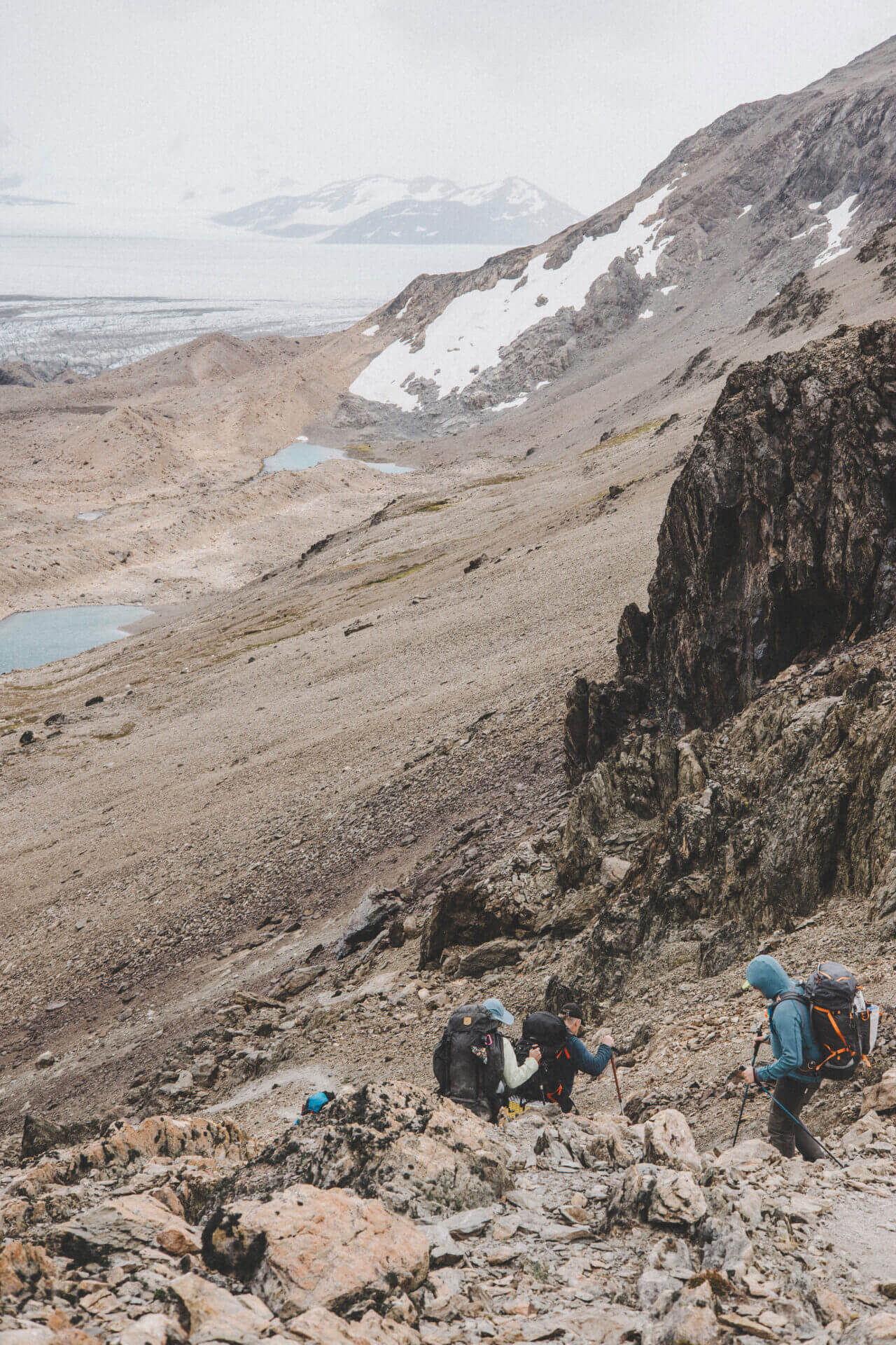 Dagen börjar tufft när vi ska upp för Huemul passet och det är lite brant på sina håll men det finns ett par fasta rep att hålla i på dessa partier men vi rör oss fortfarande på en etablerad stig. Över passet vandrar vi längs med Southern Patagonian Ice Field tills vi kommer fram till Paso del Viento campingplats. Det här är en lite tuffare dag men vi klarar det genom att gå långsamt och ta regelbundna pauser.